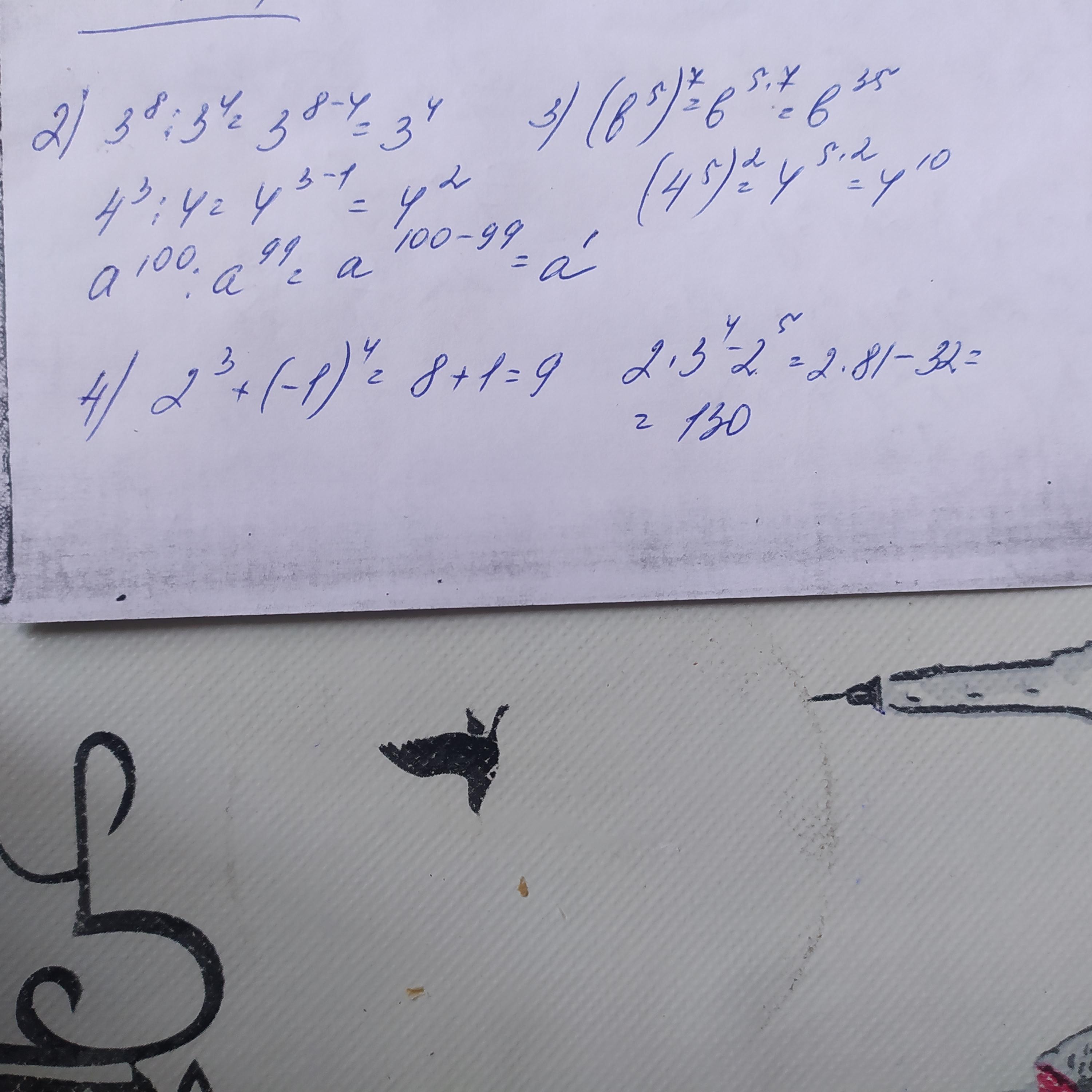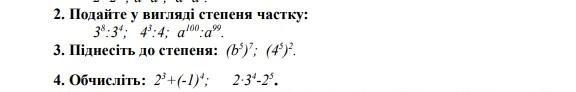2. Подайте у вигляді степеня частку: 38:34; 4³:4; a00:a. 99 3. Піднесіть до степеня: (b): (45). 4. Обчисліть: 23+(-1); 2-3¹-25.