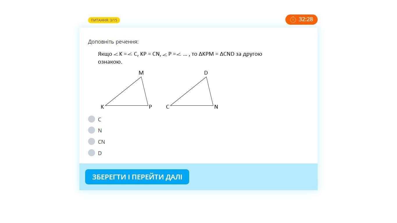 Якщо <K = <C, KP= CN, <P = <N, то ∆KPM = ∆CND за другою ознакою