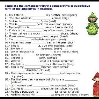 Ответ:1-more intelegent 2-the biggest 3-colder than 4-the best 5-the luckiest 6-the busiest 7-cheaper than 8-harder 9-better 10-the hottest 11-the worst 12-easier 13-the highest 14-cleverer than 15-more usifull than 16-the most common 17-longest 18-older oldest 19-tallest 20-more difficult 21-longer than 22-noisiest 23-larger than 24-angrier than