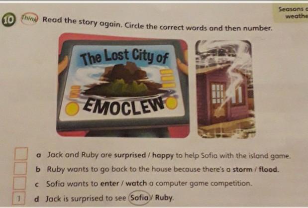 10 Think Read the story again. Circle the correct words and then number. 1 The Lost City of UUD EMOCLEWO 1 Seasons and weather a Jack and Ruby are surprised / happy to help Sofia with the island game. b Ruby wants to go back to the house because there's a storm / flood. c Sofia wants to enter / watch a computer game competition. d Jack is surprised to see Sofia/ Ruby.
