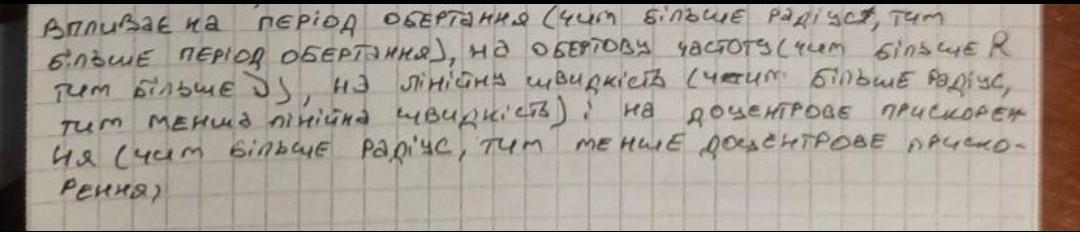 Чи впливає і якщо впливає,то як саме впливає радіус обертання на: період обертання,обертову частоту,лінійну швидкість,доцентрово прискорення