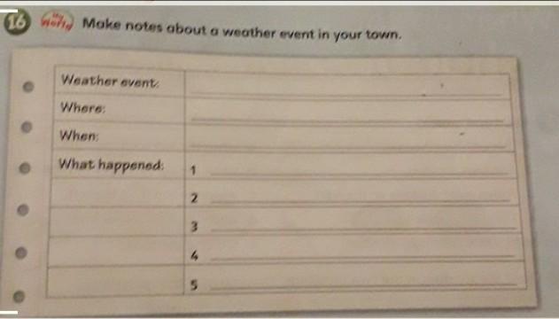 16 Worl Make notes about a weather event in your town. Weather event: Where: When: What happened: 1 2 3 4 5 weather
