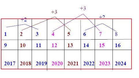 Т.о., в одной группе имеем по две пары чисел, отличающихся на 2, и две - на 3. Группа разделилась пополам на пары.