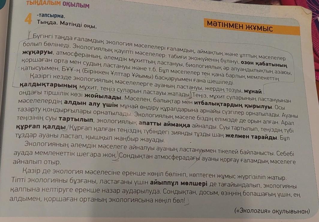 6 -тапсырма. Сұрақтарға жауап бер. Жауабынды дәлелде. 1. Ғаламдық экология мәселелерiне не жатады? 2. Неге олар «Ғаламдык мәселе» деп аталады? 3. Оларды қолға алу үшін не істеліп жатыр? 4. Өз еліңнің немесе туған жерiннiң экологиялық мәселесі кандай?