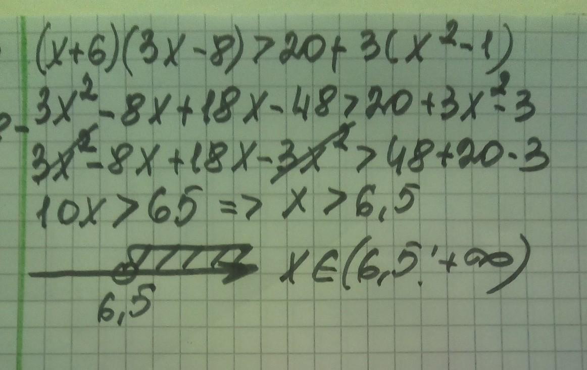 розв'яжіть нерівність (х+6)(3х-8) > 20 + 3(х²-1)