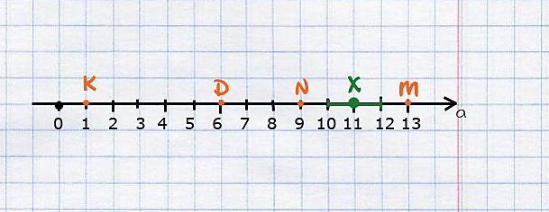 На координатном луче,единичный отрезок которого равен длине одной клетки тетради,отметьте точки М(13),N(9),D(6),K(1).На том же луче отметьте точку Х,если её координаты-натуральное число,которое меньше 12,но больше 10.