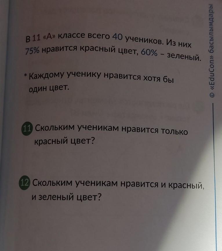 в 11 а классе всего 40 учеников.Из них 75% нравится красный цвет,60% -зеленый. каждому ученику нравится хотя бы один цвет. Скольким ученикам нравиться только красный цвет? скольким ученикам нравится и красный и зелёный цвет?