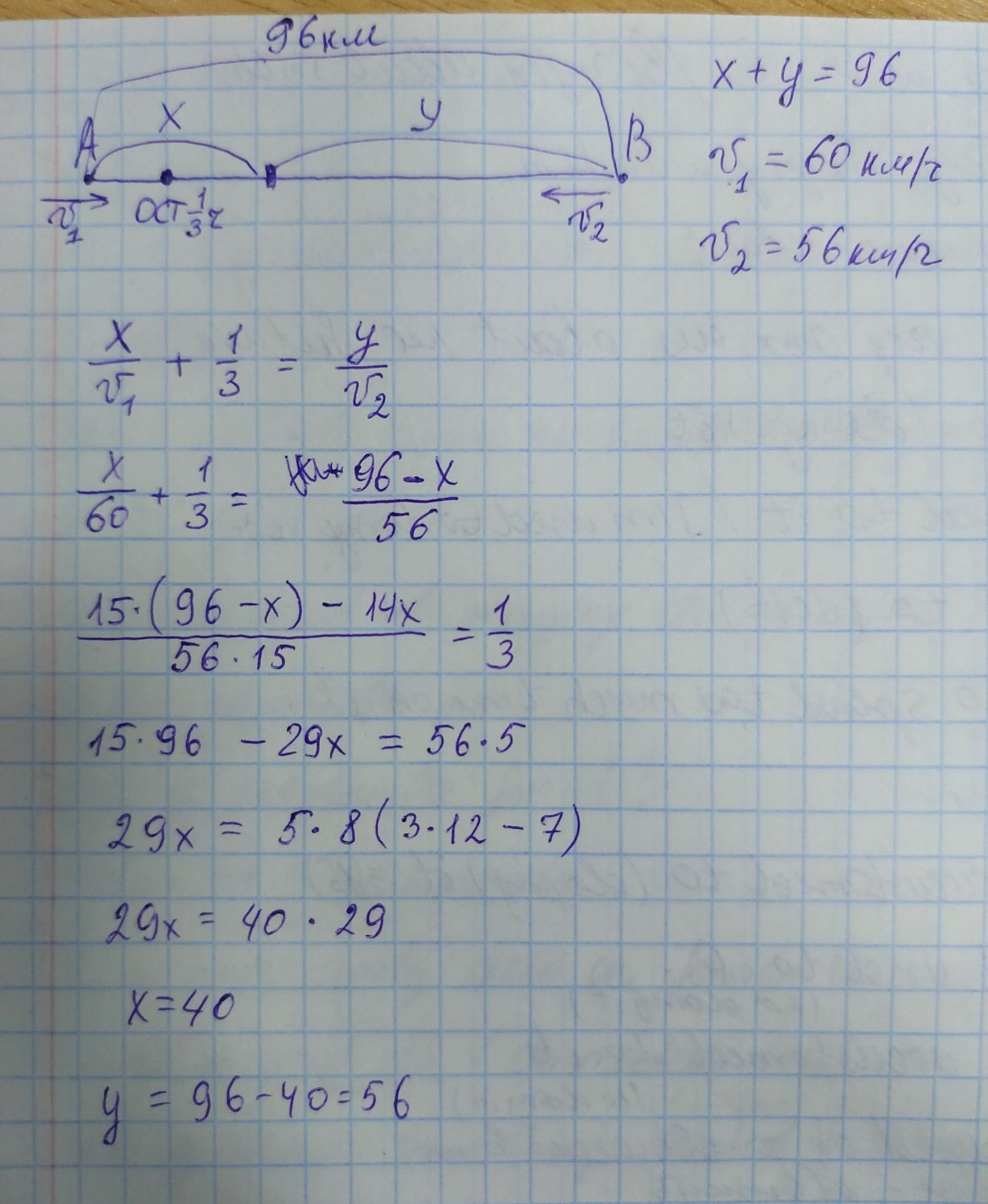 Из городов А и В, расстояние между которыми 96 км, одновременно навстречу друг другу выехали два автомобилиста. Выехавший из пункта А автомобилист, проехав какую-то часть пути, сделал остановку на треть часа, а затем продолжил движение до встречи со вторым автомобилистом. Известно, что скорость первого автомобилиста равна 60км/ч, а второго 56км/ч. На каком расстоянии от города В встретятся автомобилисты?