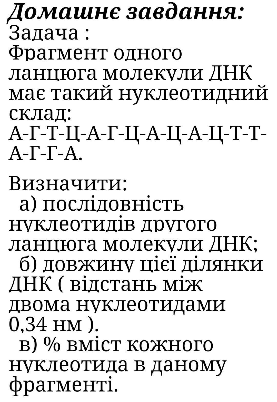 3. ДНК двох ланцюгів містить 24 нуклеотиди, А=Т=7, Ц=Г=5 нуклеотидів.