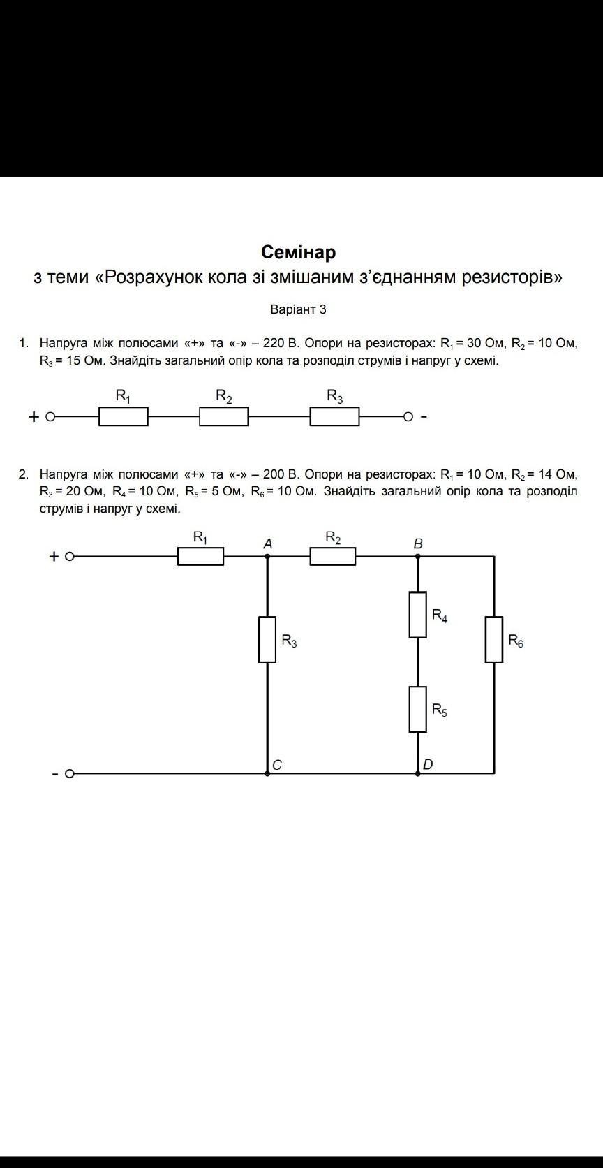 R3 = 20 Ом, R4 = 10 Ом, R5 = 5 Ом, R6 = 10 Ом. Знайдіть загальний опір кола та розподіл