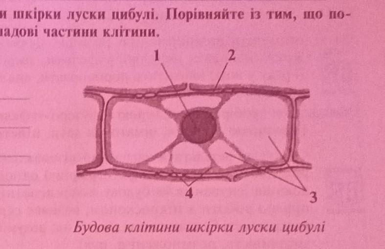 Розгляньте схематичний малюнок клітини шкіри луски цибулі порівняйте із тим що побачили під мікроскопом та підпишись складові частини клітини