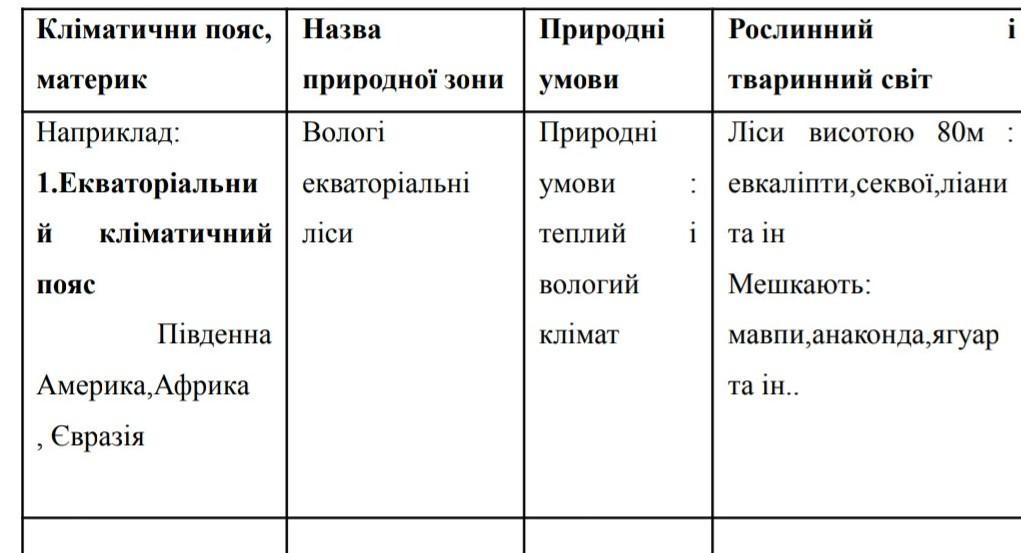 Завдання.2 Виявіть за картою природних зон, закономірності поширення природних зон по материках Землі. Результати занесіть у таблицю