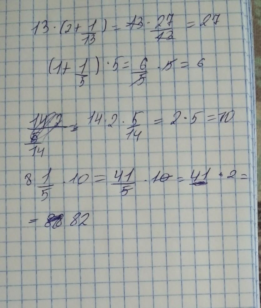 Найти значение выражения, изпульзуя распределеное свойство умножения а)13×(2+1/13) б)(1+1/5)×5 в)14×2 5/14 г)8 1/5×10