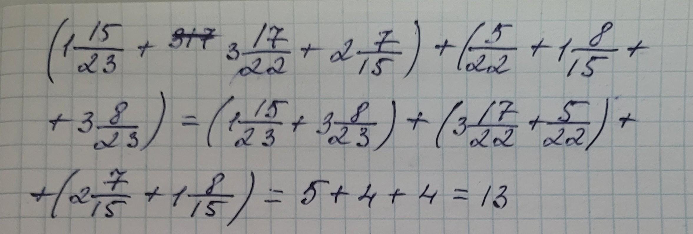 Пользуемся переместительным законом сложения. Раскрываем скобки и группируем числа по знаменателю. При сложении из смешанных дробных чисел мы получаем натуральные и легко их складываем.