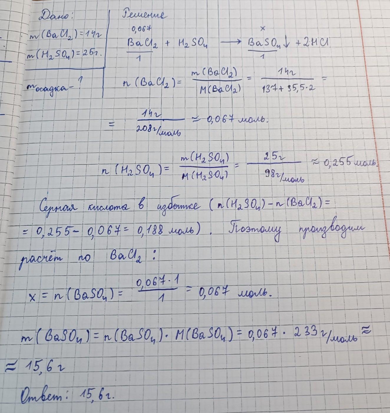 Рассчитайте массу осадка, образовавшегося при взаимодействии 14 г хлорида бария и 25 серной кислоты.