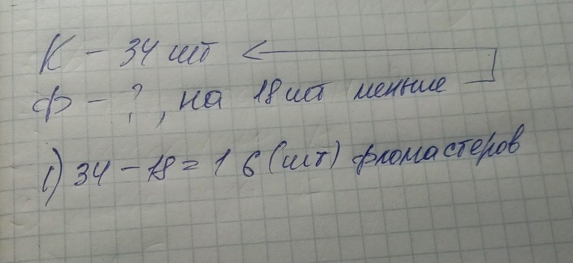 5. Построй схему к задаче. Реши задачу. у Алмата 34 карандаша, а фломастеров - на 18 меньше. Сколько фломастеров у Алмата?