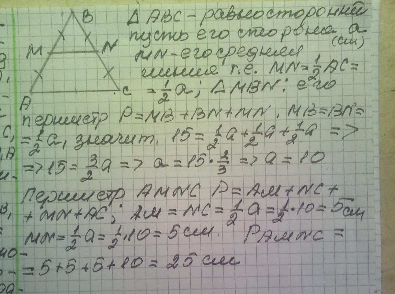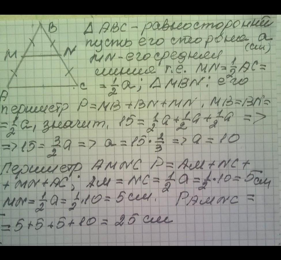 3) Точки М и N-соответственно середины сторон АB и BC равностороннего треугольника ABC. Периметр треуголь- ника BMN равен 15. Вычислите периметр четырехугольни- ка AMNC DOVE