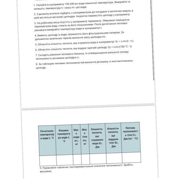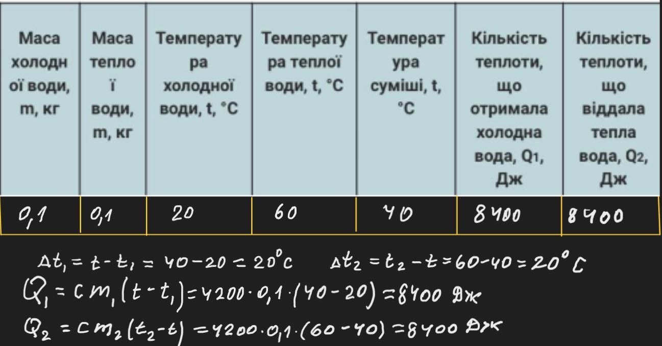 Висновок: Кількість теплоти, яку отримала холодна вода дорівнює кількості теплоти, яку віддала тепла вода