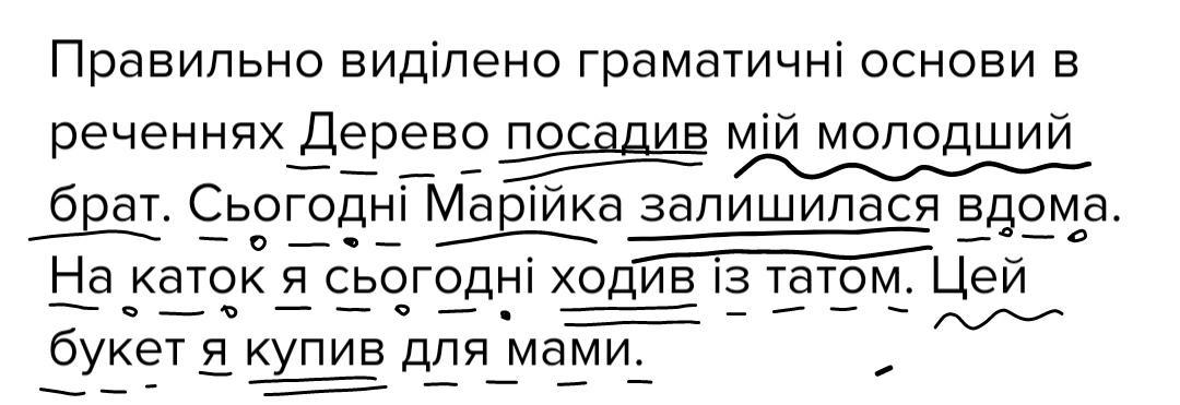Правильно виділено граматичні основи в реченнях Дерево посадив мій молодший брат. Сьогодні Марійка залишилася вдома. На каток я сьогодні ходив із татом. Цей букет я купив для мами.