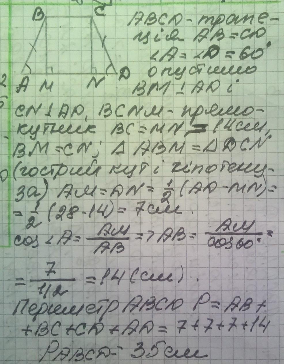 Гострий кут рівнобічної трапеції дорівнює 600, а основи – 14 см і 28 см. Знайдіть периметр трапеції ДАЮ 100 БАЛЛОВ