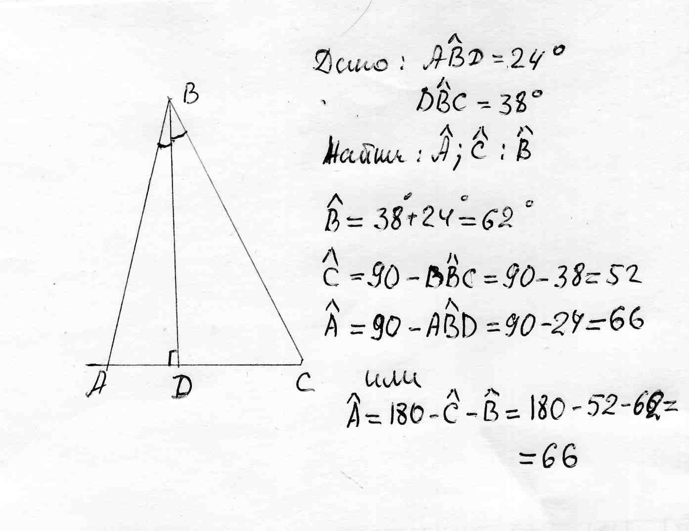Высота остроугольного треугольника АВС образует со сторонами, выходящими из той же вершины, углы 24(градуса) и 38 (градусов). Найдите углы треугольника?