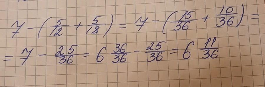 7-(5/12+5/18)=> НОК(12;18) = 36=>7-(15/36+10/36)=7-25/36 = 6 36/36-25/36=