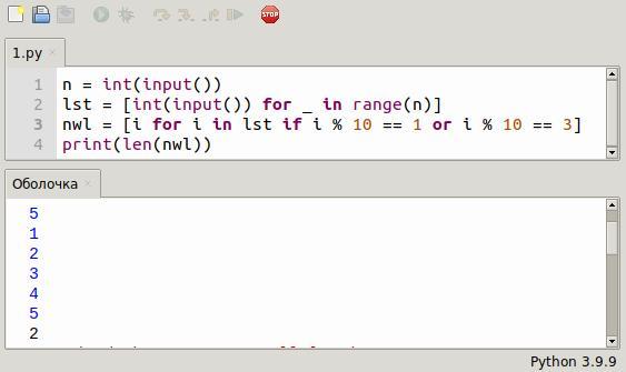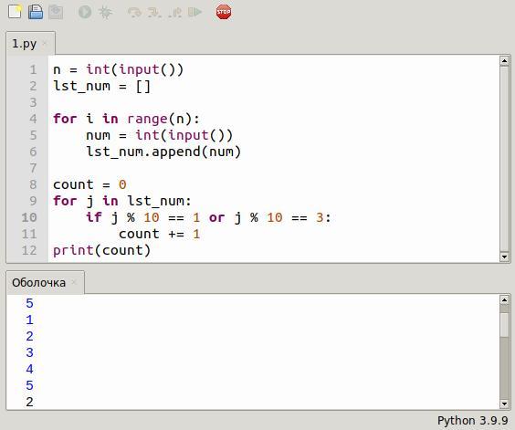 срочно ! помогите пожалуйста! На вход подаётся число N, а затем и целых чисел в столбик. Записать их в массив. Найти и вывести количество чисел, оканчивающихся на цифру 1 или 3. питон.