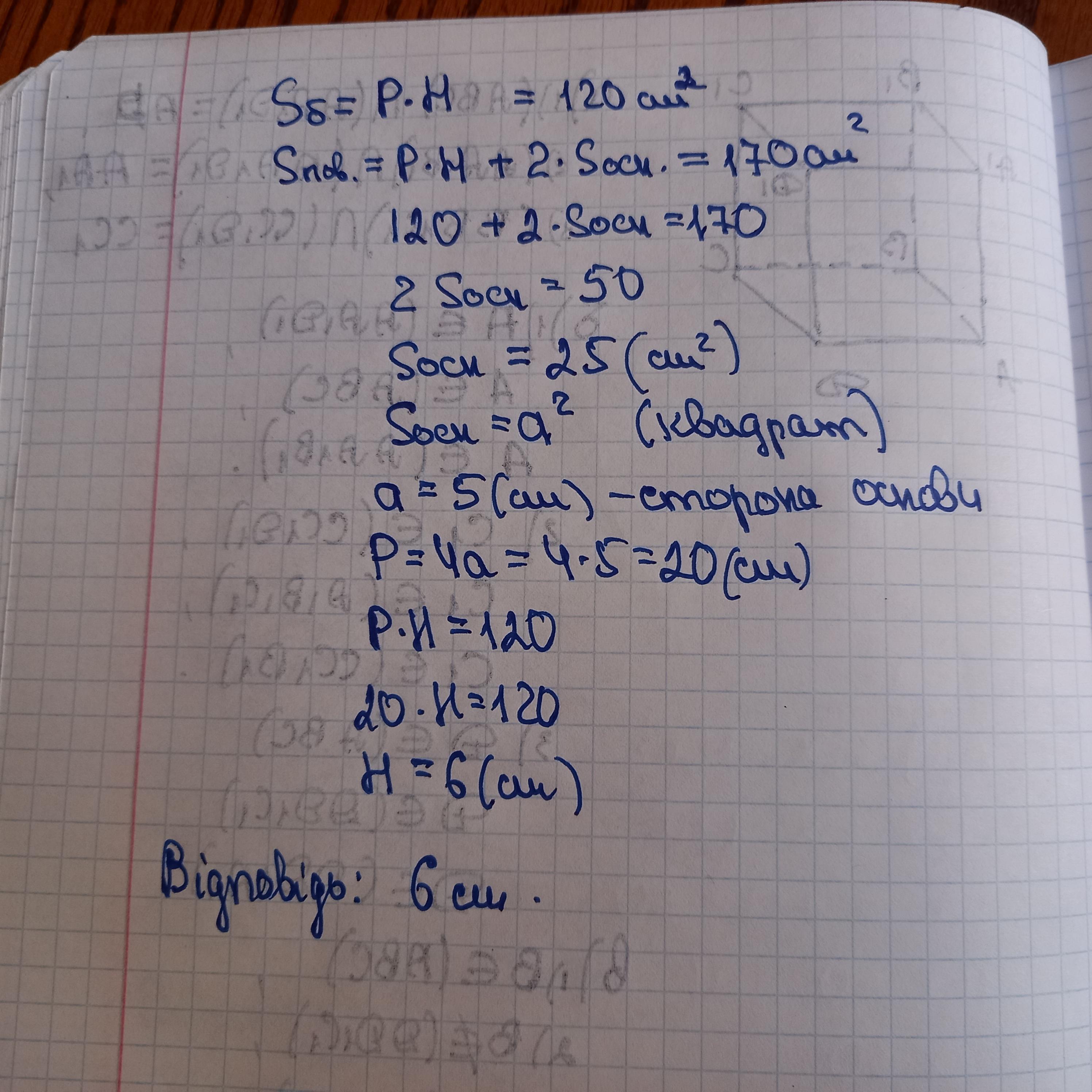 Площа бічної поверхні правильної чотирикутної призми дорівнює 120 см3,