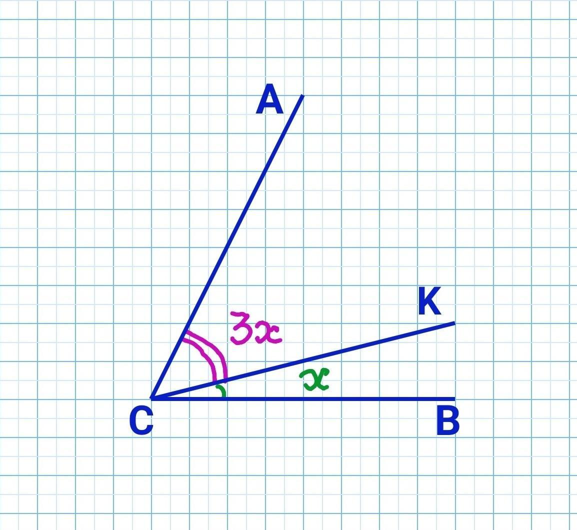 Нехай ∠BCK= х°, тоді ∠АСК=(3х)°, так як ∠ACB=∠BCK+∠ACK, та за умовою ∠ACB=60°, складаємо рівняння: