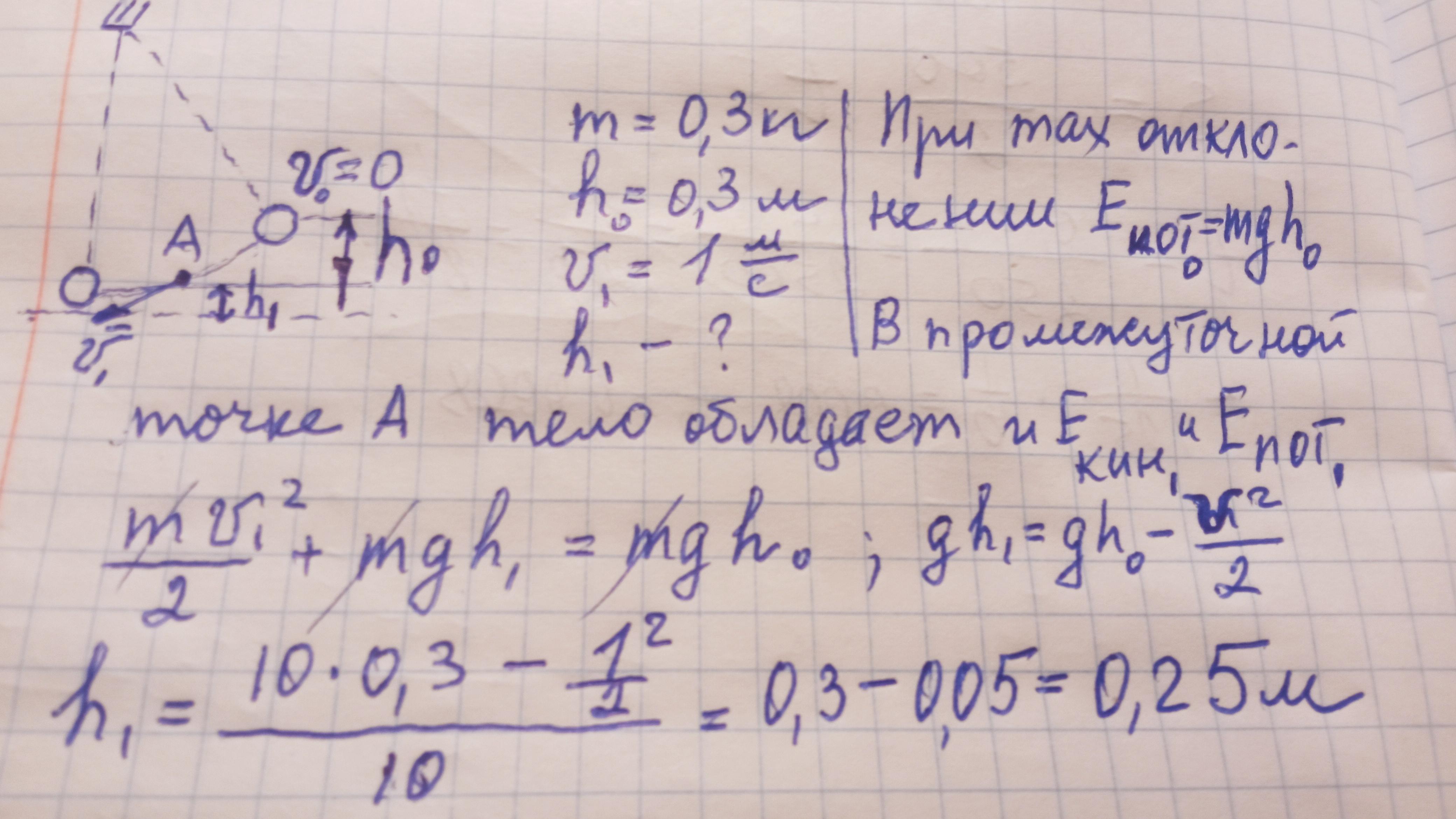 Шар массой 300 г. подвешенный на нити, откланённый от положения равновесия и поднимается на высоту 30 см. На какой высоте его скорость будет равна 1 м/с?