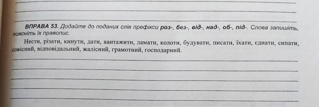 Рознести, віднести, піднести; розрізати відрізати, надрізати, обрізати; відкинути, підкинути; роздати, віддати; розвантажити, відвантажити; розламати, відламати, надламати, обламати; розколоти, відколоти, підколоти; відбудувати; розписати, надписати, підписати; від'їхати об'їхати під'їхати; роз'єднати від'єднати об'єднати під'єднати; розсипати, відсипати, обсипати, підсипати; безсовісний; безвідповідальний; бнзжалісний; безграмотний; безгосподарний.