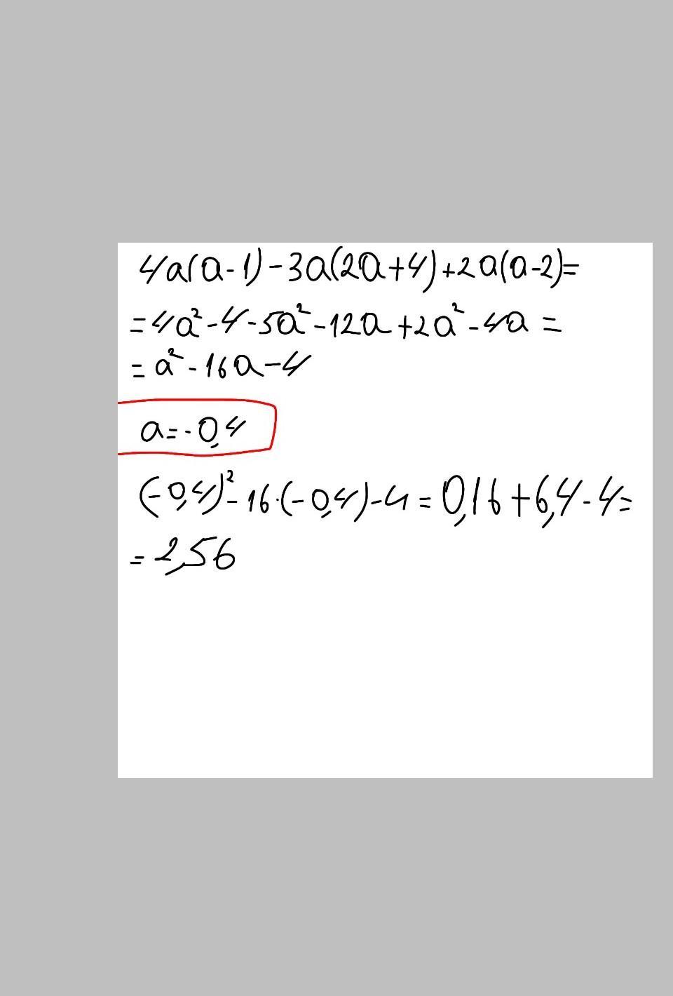 Спростіть вираз 4а(а – 1) – 3а(2а + 4) + 2а(а – 2) і знайдіть його значення при а= - 0,4.