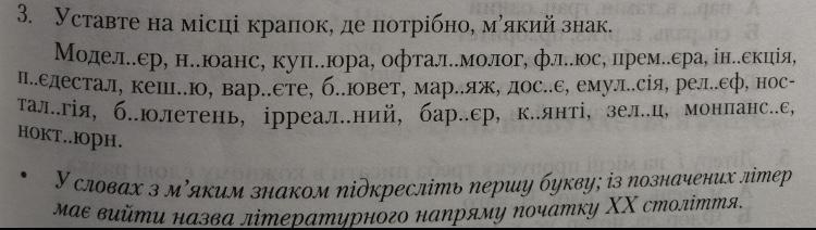 МоделЬєр,нюанс,купюра,офталЬмолог,флюс,прем'єра,ін'єкція,п'єдестал,кеш'ю,вар'єте,бювет,мар'яж,досЬє,емулЬсія,релЬєф,носталЬгія,бюлетень,ірреалЬний,бар'єр, к' янті, зелЬц, монпансЬє,ноктюрн.