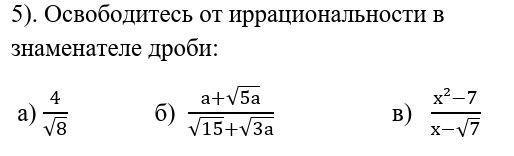 Освободитесь от иррациональности в знаменателе дроби: а) 4/√8 б) (а+√5а)/(√15+√3а) в) (х²-7)/(х-√7)