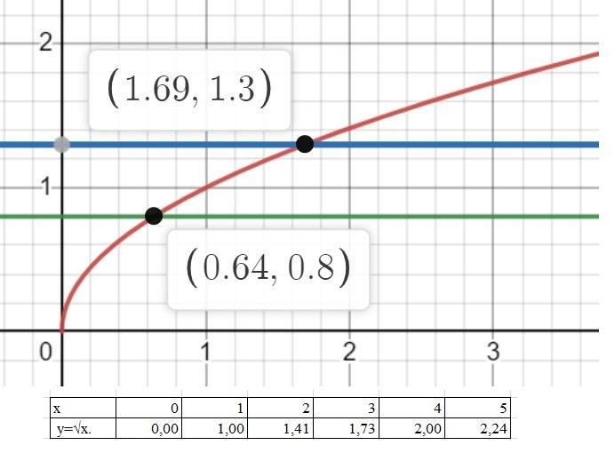 Строим график функции и прямые у=1,3. у=0,8 и находим значения х.