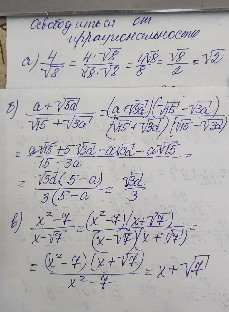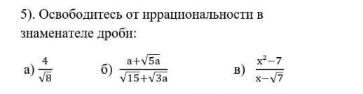 5). Освободитесь от иррациональности в знаменателе дроби: a) 4 √8 б) a+√5a V15+V3a B) X²-7