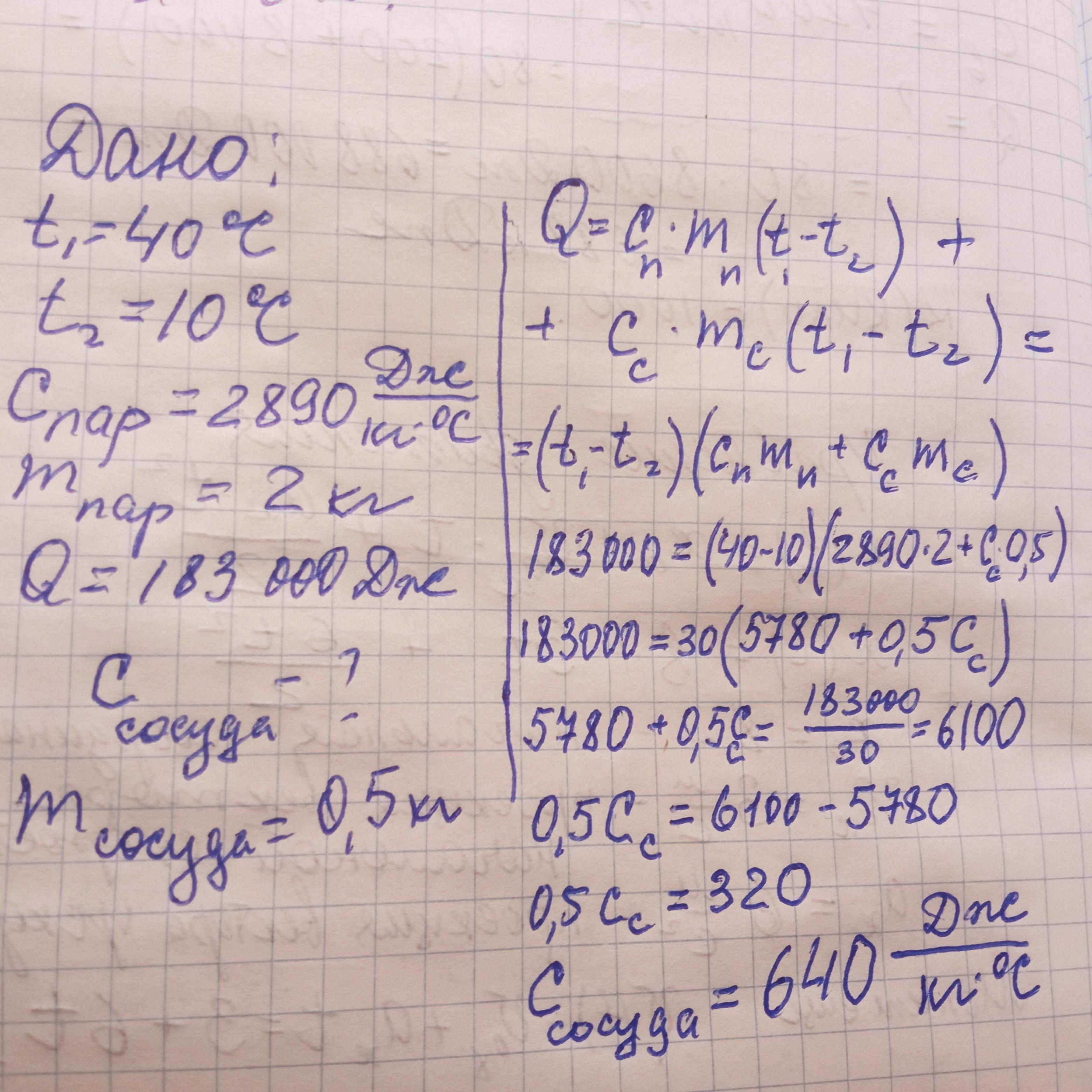 2. При охолодженнi вiд 40 °С до 10ºС посудини масою 500 г, в якій міститься 2 кг парафіну, виділилося 183 кДж теплоти. Яка питома теплоємність речовини, з якої виготовлено посудину?