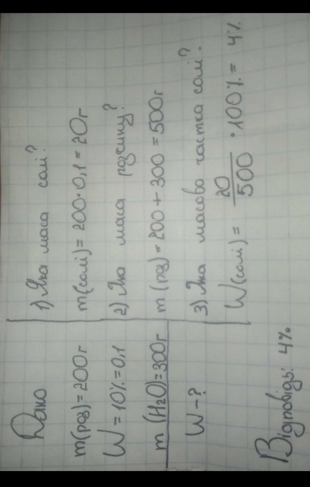 до 200г розчину натрій хлориду з масовою часткою солі 10% долили 100г води.Визначте масову частку солі в утвореному розчину.