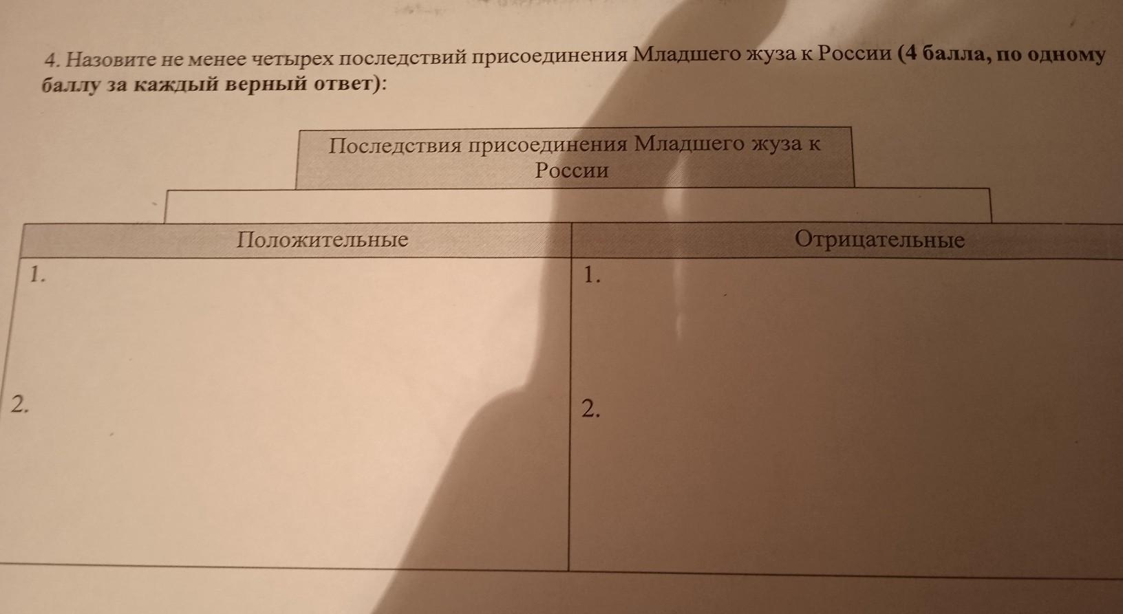 4. Назовите не менее четырех последствий присоединення Младшего жуза к России (4 балла, по одному баллу за каждый верный ответ): Последствия присоединения Младшего жуза к России Положительные 1. отрицательные