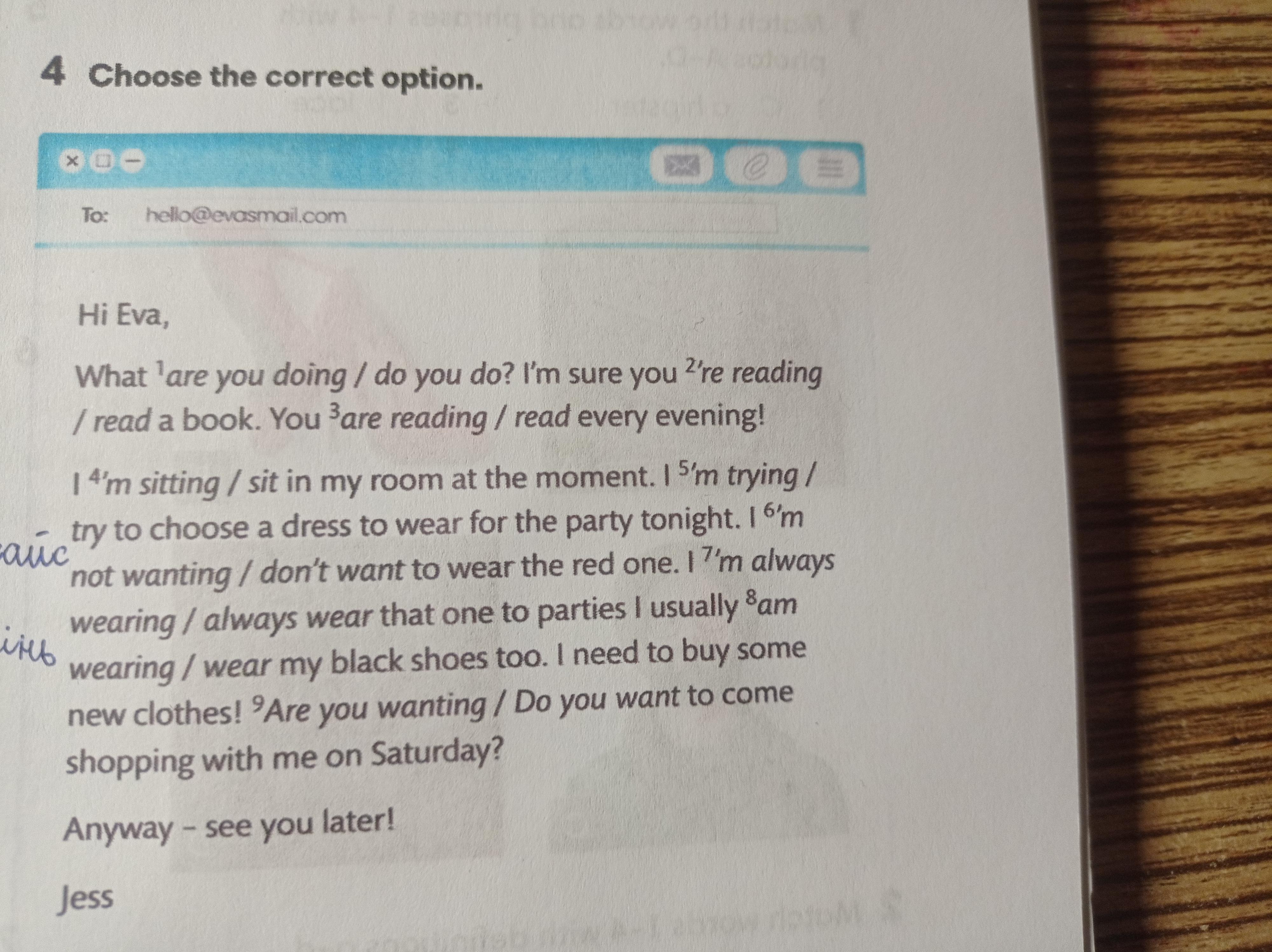 im sitting in my room at the moment. im trying to choose a dress to wear for the party tonight. I dont want to wear a red one. i always wear that one to parties. i wear my black shoes too. i need to buy some new clothes! Do you want to come shopping with me on saturday?