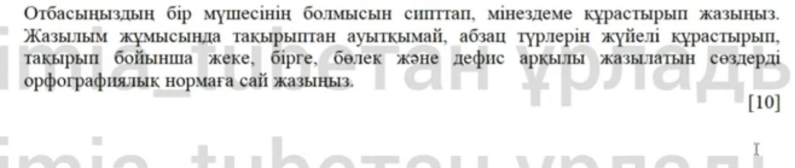 Отбасыныздын бір мүшесінің болмысын сипттап, мінездеме құрастырып жазыңыз. Жазылым жұмысында такырыптан ауытқымай, абзац түрлерін жүйелі құрастырып, такырып бойынша жеке, бірге, бөлек және дефис аркылы жазылатын сөздерді орфографиялык нормаға сай жазыныз. ПОЖАЛУЙСТА КӨМЕКТЕСІҢІЗДЕРШІ