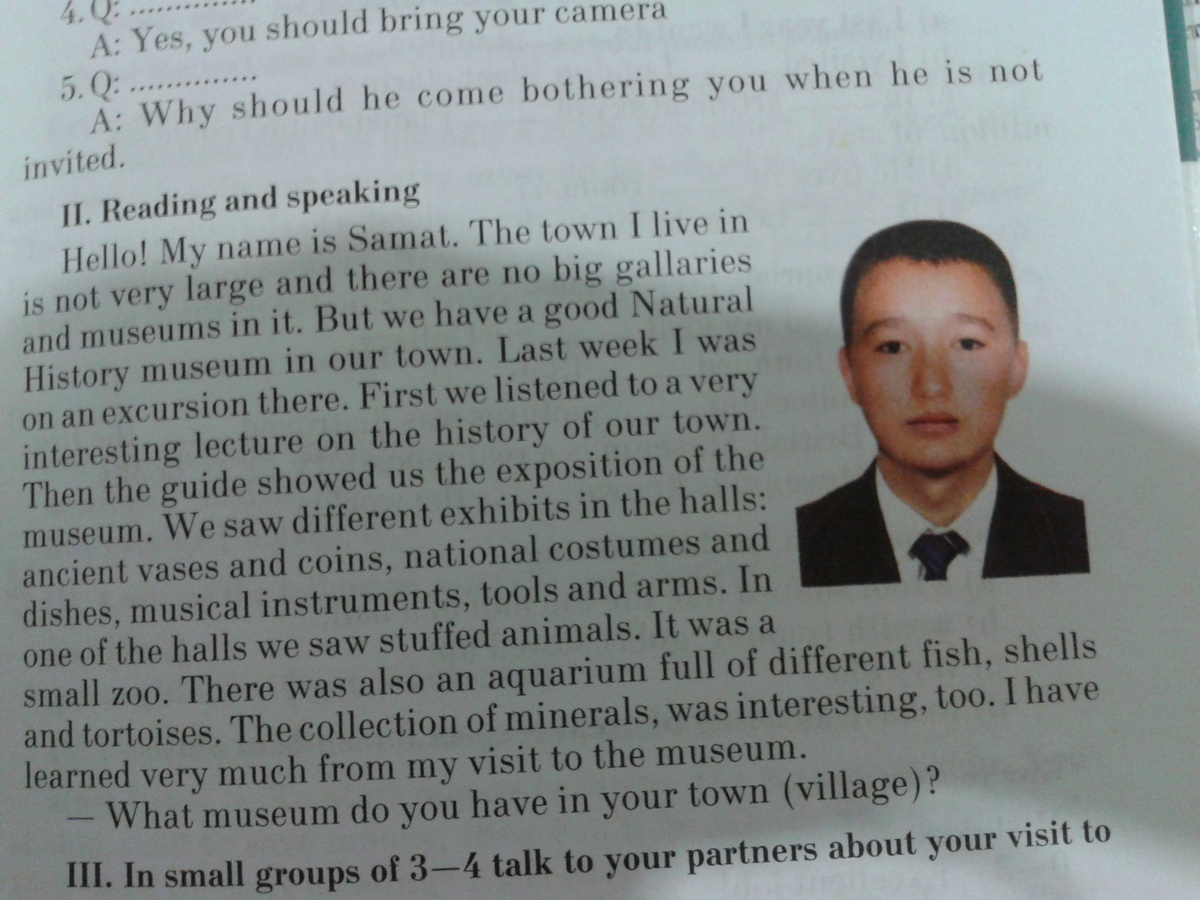Моё имя Самат. Город, в котором я живу, не очень большой и больших галерей и музеев здесь нет. Но в нашем городе есть хороший Краеведческий музжей (название музея может быть не совсем верное у меня).