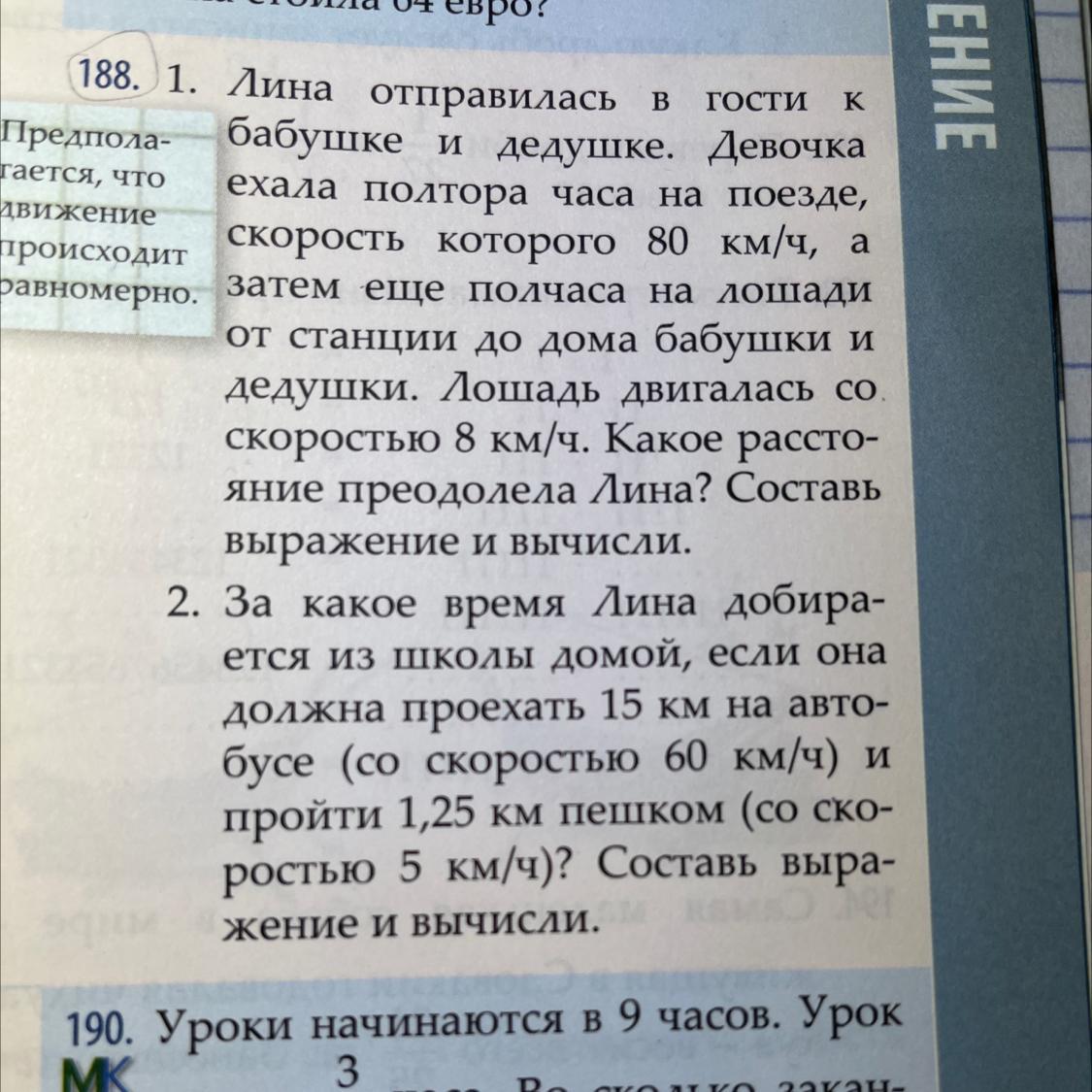 1. Лина отправилась в гости к бабушке и дедушке. Девочка ехала полтора часа на поезде, скорость которого 80 км/ч, а