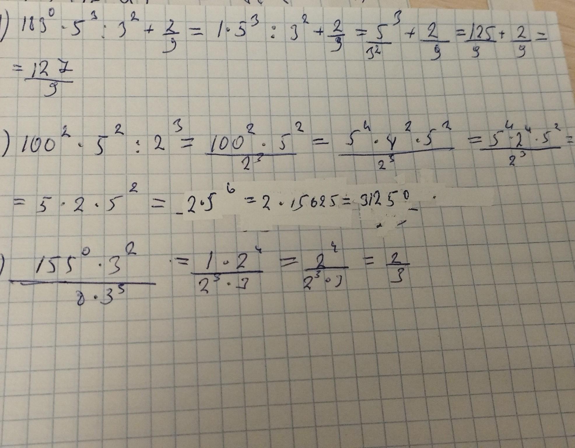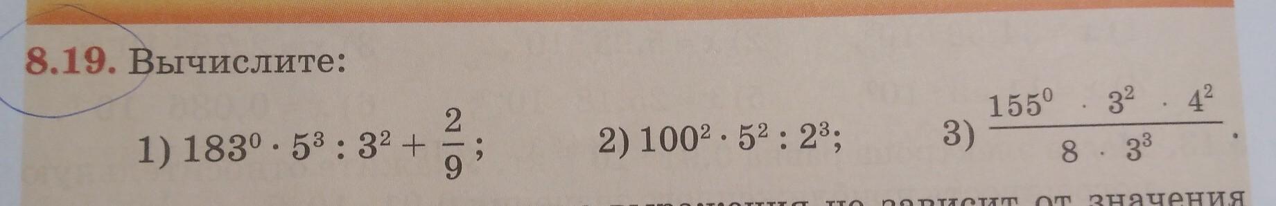8.19. Вычислите: 1) 183⁰ 5³:3² + 2) 100² 52: 2³; 3) 155⁰ 8 33 . 4² Помогите пожалуйстаааааа плиссс