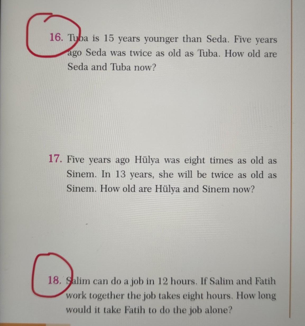 16.Туба на 15 лет моложе Седы. Пять лет назад Седа была вдвое старше Тубы. Сколько сейчас лет Седе и Тубе?