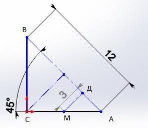 1. Точка М- середина катета АС рівнобедреного прямокутного трикутника АВС, гіпотенуза якого AB дорівнює 12см. Знайти відстань відточки M дo сторони АВ.