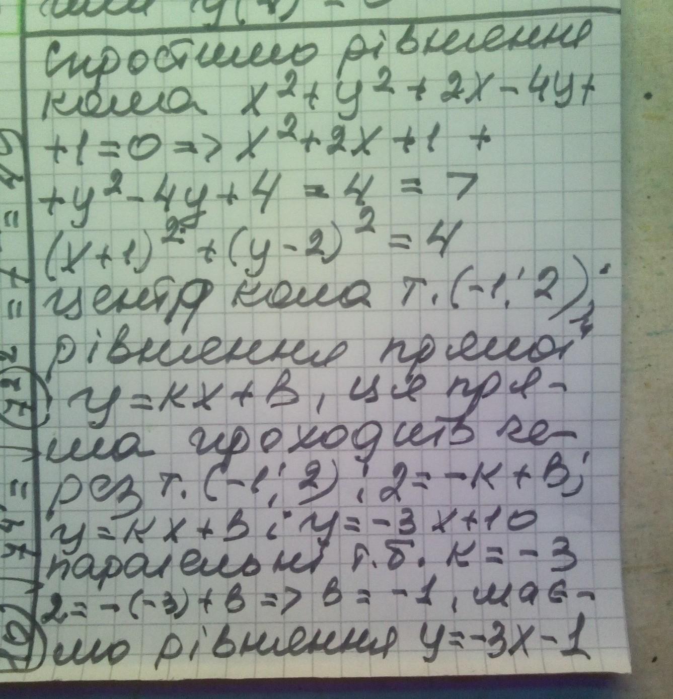 Складіть рівняння прямої, яка паралельна прямій у = - 3х + 10 і проходить через центр кола х2 + у2 + 2х – 4у + 1 = 0