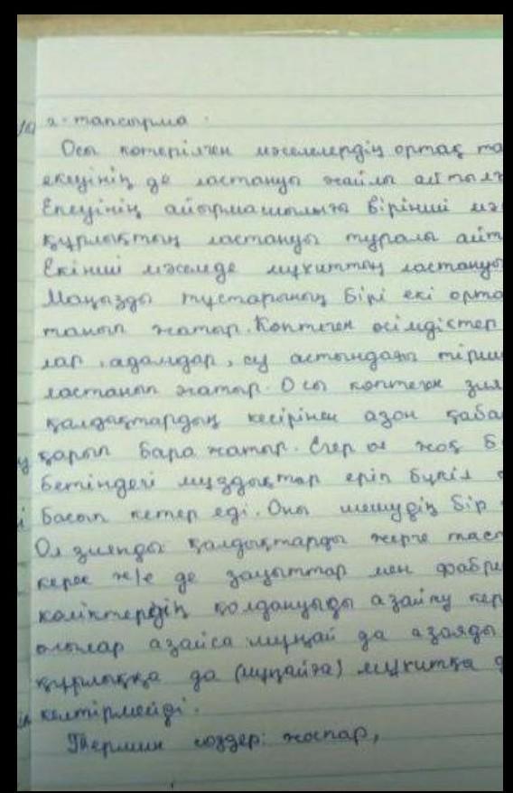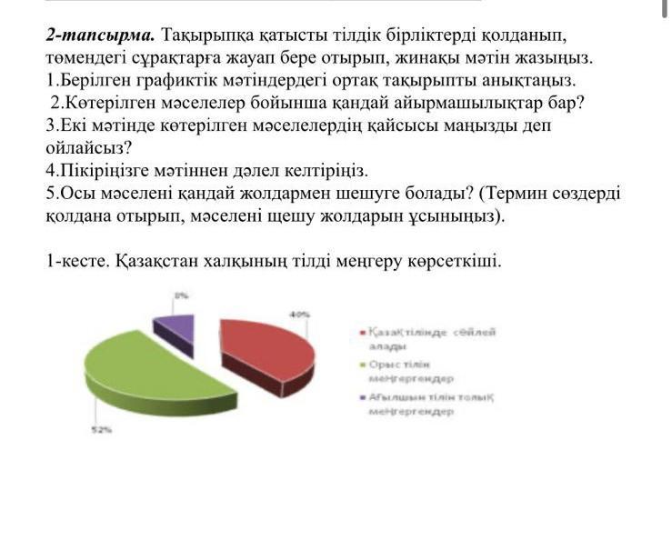 2-тапсырма. Тақырыпқа қатысты тілдік бірліктерді қолданып, төмендегі сұрақтарға жауап бере отырып, жинақы мәтін жазыңыз. 1.Берілген графиктік мәтіндердегi ортак такырыпты анықтаңыз. 2. Көтерілген мәселелер бойынша кандай айырмашылықтар бар? 3.Екі мәтінде көтерілген мәселелердiң кайсысы маңызды деп ойлайсыз? 4.Пікірінізге мәтіннен дəлел келтiрiнiз. 5.Осы мәселенi кандай жолдармен шешуге болады? (Термин сөздерді колдана отырып, мәселені щешу жолдарын ұсыныңыз). 1-кесте. Казакстан халкынын тiлдi меңгеру көрсеткіші. • Қазақ тілінде сейлей алады Орыс тiлiн меңгергендер • Агылшын тілін толық меңгергендер