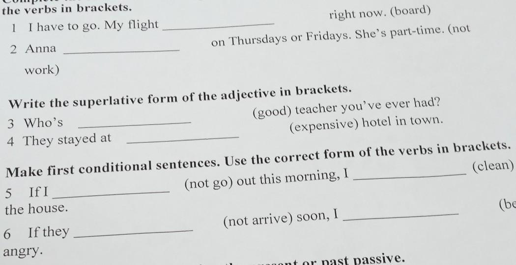 Complete the sentences with the present simple or present continuous forms of the verbs in brackets. 1 I have to go. My flight 2 Anna work) right now. (board) on Thursdays or Fridays. She's part-time. (not Write the superlative form of the adjective in brackets. 3 Who's 4 They stayed at (good) teacher you've ever had? (expensive) hotel in town. помогите пожалуйста срочнооо