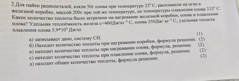 Q=c1*m1*(t2-t1)+λ*m1+c2*m2*(t2-t1)=250*0,05*(232-22)+5,9*10⁴*0,05+460*0,2*(232-22)=24895Дж